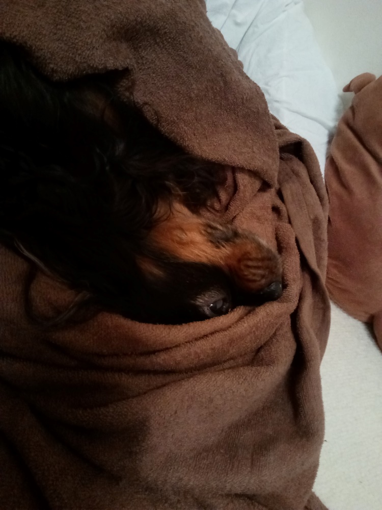 我が家に来た初日の画像です。不思議な事に花梨のベッドで自然に落ち着き、ねんぐう。