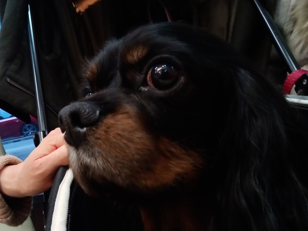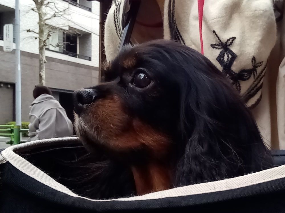 人を見かけると走り寄ってしまうので、危なくて未だに歩道は歩けません。動物病院にはカートに乗ってお出掛けです。カートに箱乗りするのは、花梨と一緒ですね。