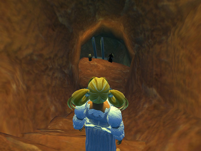 以前、日記に書きましたが、EQ2 は思いもよらぬところがデータ化されていて、建物の屋根や城壁、塔や木の上に飛び乗ることができます。これは前出の Ruins of Varsoon 入り口にある梯子を登った、さらに上。この梯子がダンジョンの内外を出入りするスイッチとなっているため、梯子の上に登った事がある人は少ないかもしれません。ただ、この先は行き止まりで、どれだけ上に登っても地上には出られませんので、あしからず。