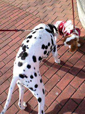 雨の中の散歩になったので、お友達と会えないかと思っていたのですが、花梨ちゃんの大の仲良し、ダルメシアンのロンくんと遭遇しました。