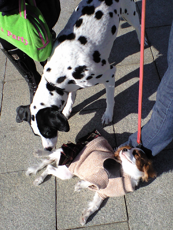 この Blog でもすっかりおなじみ、お友達のダルメシアン・ロンくんに会った途端、いつもの通り、遊んでアピール。わはははは、スカート姿も台無しです。