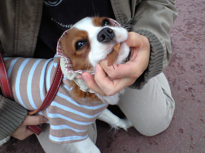 風に吹かれる落ち葉をゲット! 放っておくと食べてしまうので、すぐに出させるのですが、元気百倍、なかなかに放しません。飼い主にとって、この表情がたまらなく愛しく……。