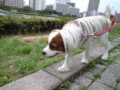 道行く人は、スヌード姿を驚いたり、面白がったり。長い耳の犬種には必須なのですが、良く犬を知らない人から見れば、確かに面白い光景かもしれませんね。