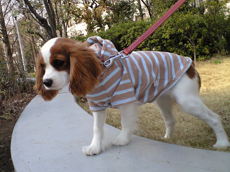 3/3、制作意欲に火が付いた奥さんお手製のパーカーを着て、いざお散歩へ。ちなみにこのパーカーは、[ おうちで作る、イヌの服 ― カワイイを着てでかけよう ! 」 を参考に作った物です。