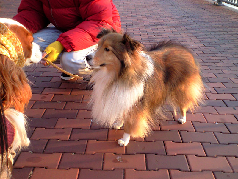 「 早く帰って、NHK 朝の連続テレビ小説 「 瞳 」 総集編の後編を見なくては……。 」 と、焦る奥さんを他所に、一方をじっと見つめ、動かない花梨姫。それもそのはず、視線の先には、仲良しのシェットランド・シープドッグ・陸くんがいました!