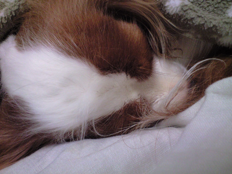 家に帰れば、自分のベッドでお気に入りの毛布に包まり、ぐっすり。どれだけカメラを近付けても、まったく起きませんでした。また、明日も遊びに行こうね。