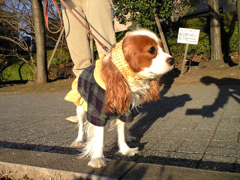 昨日は、一昨日に花梨へのお年玉として作った洋服に合う、紺の生地でスヌードを制作した奥さん。勢い余って……というより、生地が余って、もう 1 着、フードとスカート部分の色違いヴァージョンを製作する事に。今朝は、早速、新作を着てのお出かけです。