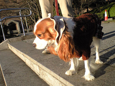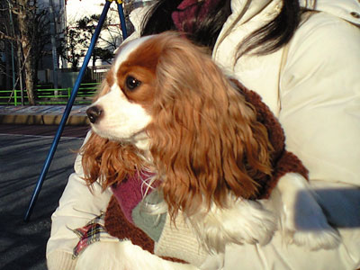 手編み第 2 弾を横からパチリ。背中はフィッシャーマンという編み方になっています。現在、奥さんは第 3 弾を鋭意制作中。ピンクと黄色のパステルのワンピースになるのだとか。ブレンハイムの毛色とマッチするかどうか、イマイチ不安。どうなる事やら。