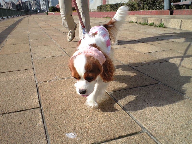 「 いざ、出発だわん! 」 と、やる気に満ちた花梨姫。今朝は、去年買った Nina の春夏物シャツを着てお出かけです。テラスに着いた途端、気の向くまま、あっちに行ったり、こっちに行ったり……、いつものお散歩を楽しみました。