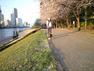 すっかり留守にしている間に、桜の花が咲き乱れ、花散る季節となってしまいました。いつもの散歩コース、隅田川沿いのテラスは、川からの風が吹くからか、やや気温は低め。開花の一般的なタイミングよりも 1 週間ほど、遅いのです。そんな訳で、我が家の花梨姫は、散歩の度に舞い散る桜の花を追いかけては怒られる、追いかけては叱られる事の繰り返し。もう 2 歳半と、すっかりお姉さんな年齢ですが、幾つになっても、追いかけ癖が直りません。