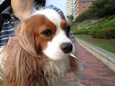 この後、お散歩仲間のミックスのシェパちゃん、ミックスのラッキー、コーギーのリンちゃん、最近、越してこられたシーズーの新 ( あらた ) くんと出会ったのですが、どの子が寄ってきても、羽根をくわえたまま。大好きなシェパママが抱っこしようとしても、身を固くして応じる素振りすら見せませんでしたさ。困ったちゃんですねえ。