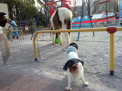 帰り道のあかつき公園では、雪の降らない東京に暮らす子供たちのために、中央区恒例・雪祭りが行われていました。まだ朝だというのに多くの子供たちで賑わっていたので、素通りするつもりだったのですが、ブランコのところに、なんと! ポニーの姿が!!