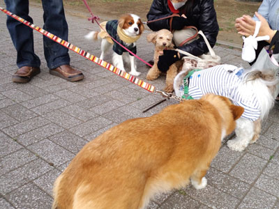 仲良しのコーギー・倫ちゃんとシーズー・新くんと出会いました。我が家の花梨もわんこらしく、みんなと一緒にご挨拶です。くんくん。