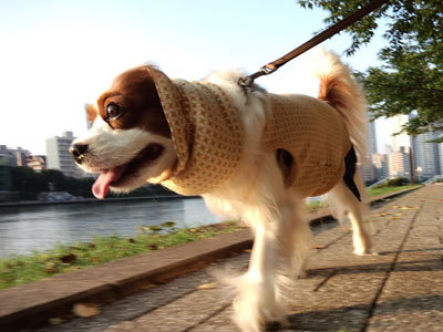 これは今朝のお散歩での 1 ショット。もうすっかり元気になりました。以前と同じように、いつもの散歩コース・隅田川テラスを走り回っています。