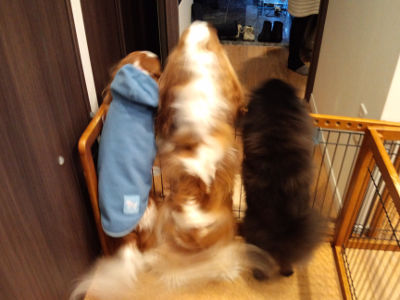 この日は、ご近所わんこが集まって、しばし築地を離れるライ坊家の追い出し会をしました。我が家に集合したのは、黒ポメの [ ポポちゃん ] と、主役の [ ライナス坊 ] 。