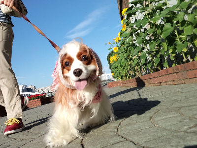 さすがに 06:00 前ですので、さほど暑くはなかったのですが、首に保冷剤を巻いて、お出かけです。元気一杯な我が家の花梨姫。目が活き活きとしていますね。