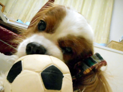 音が鳴らなくなった後は、いつものように興味が半減。今は小さなサッカーボールと大きなボールを同時に投げて、気になる方を追い掛けるというスタイルで遊んでいます。これからもいろいろ工夫しながら、お姫の興味を引かなければ! うううむ、わんこの興味をずっとずっと引き付けてくれるおもちゃはないものでしょうか。
